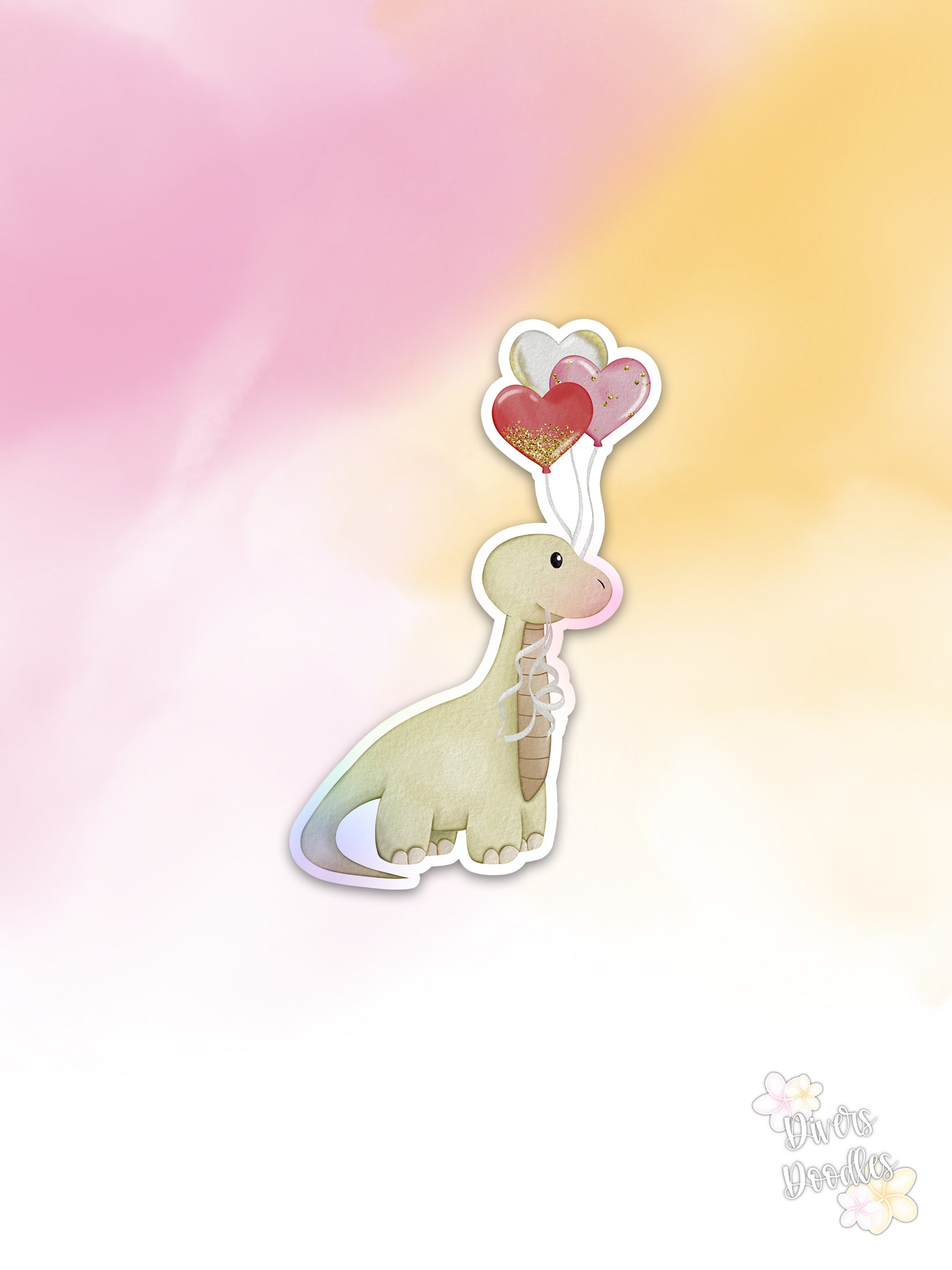 Hand drawn Brontosaurus dinosaur with a set of heart balloons. Perfect gifts or party favors for your dinosaur loving adults and kids.