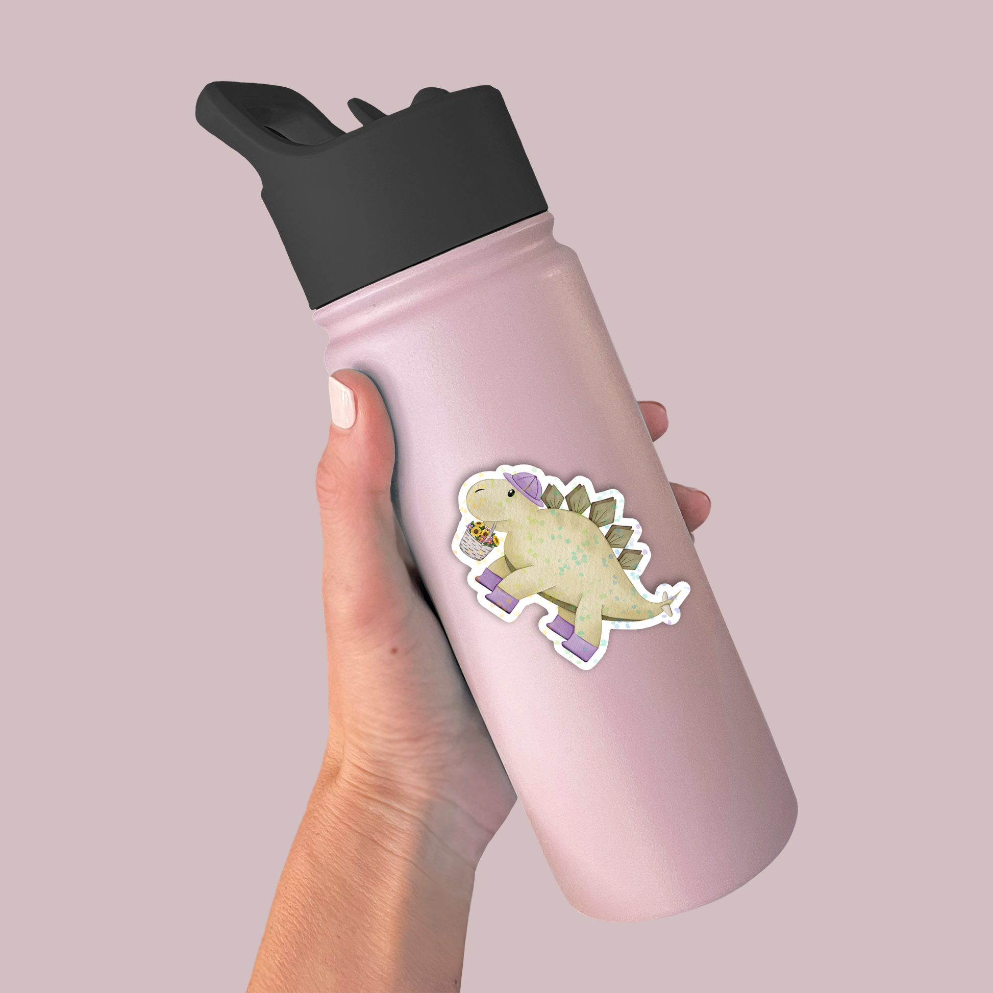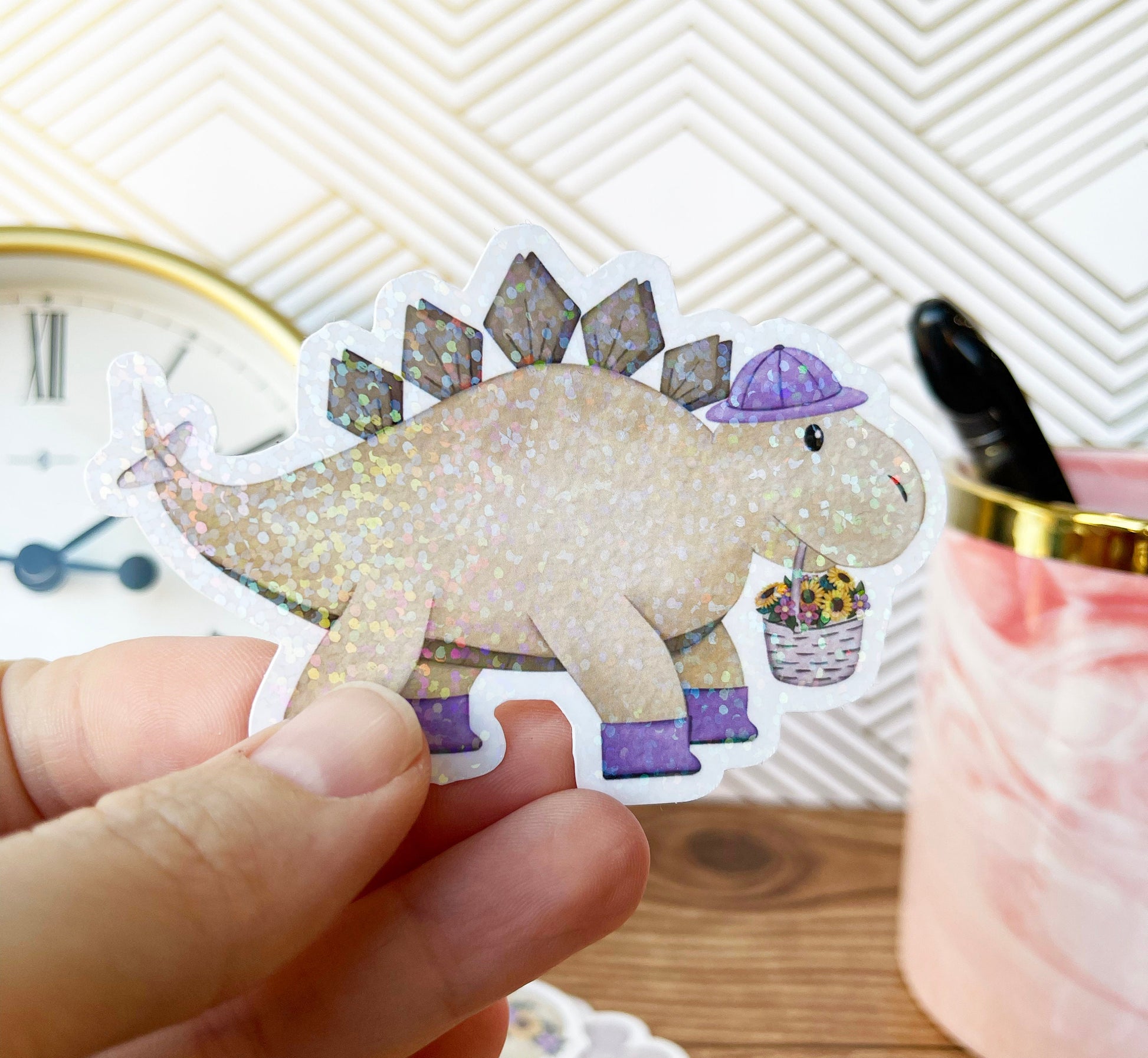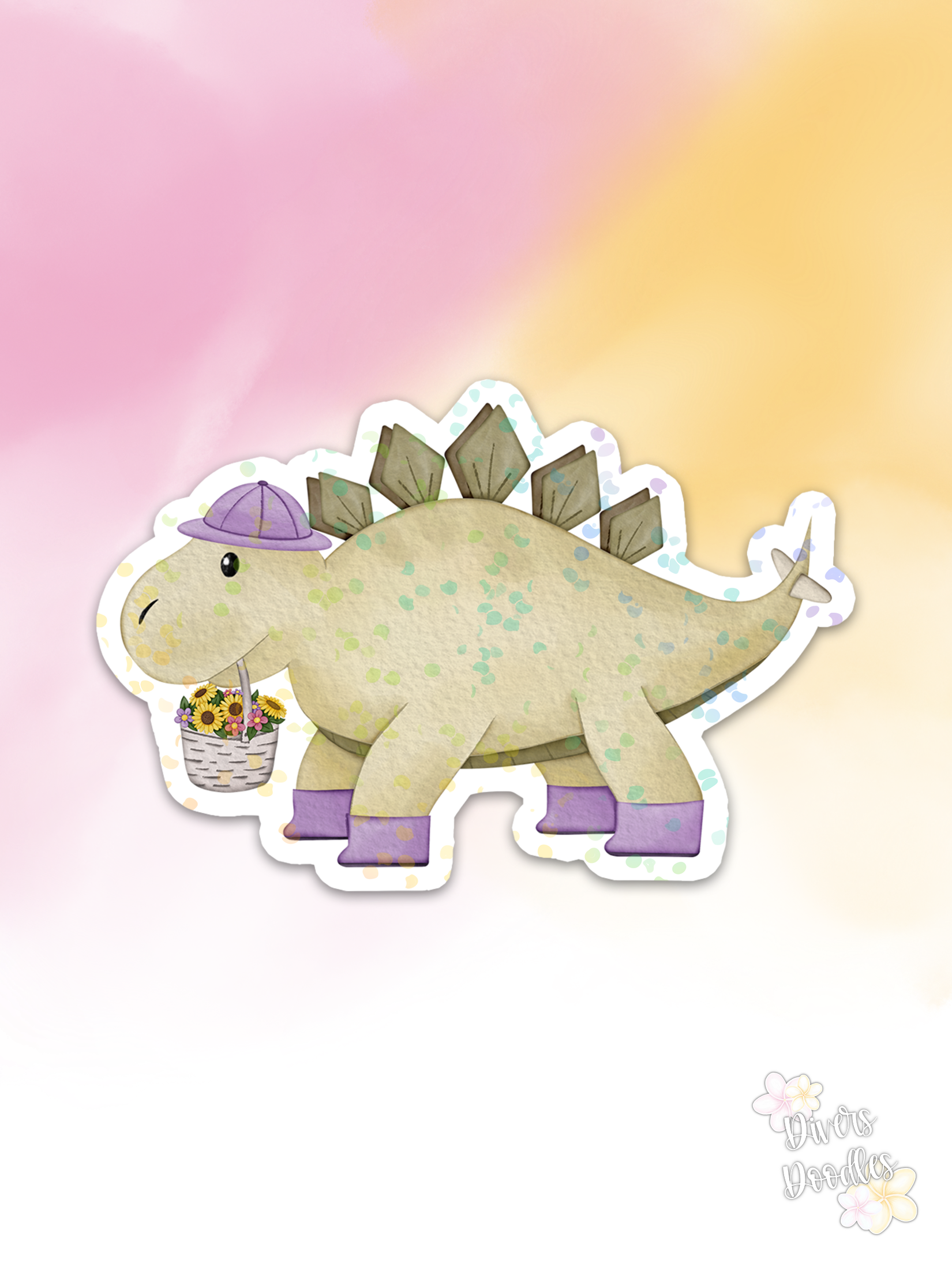 Hand drawn Stegosaurus dinosaur with a basket full of flowers and rain hat and boots combo. Perfect gifts or party favors for your dinosaur loving adults and kids. Fill those easter baskets for your teens and kids with some unique holographic stickers!
