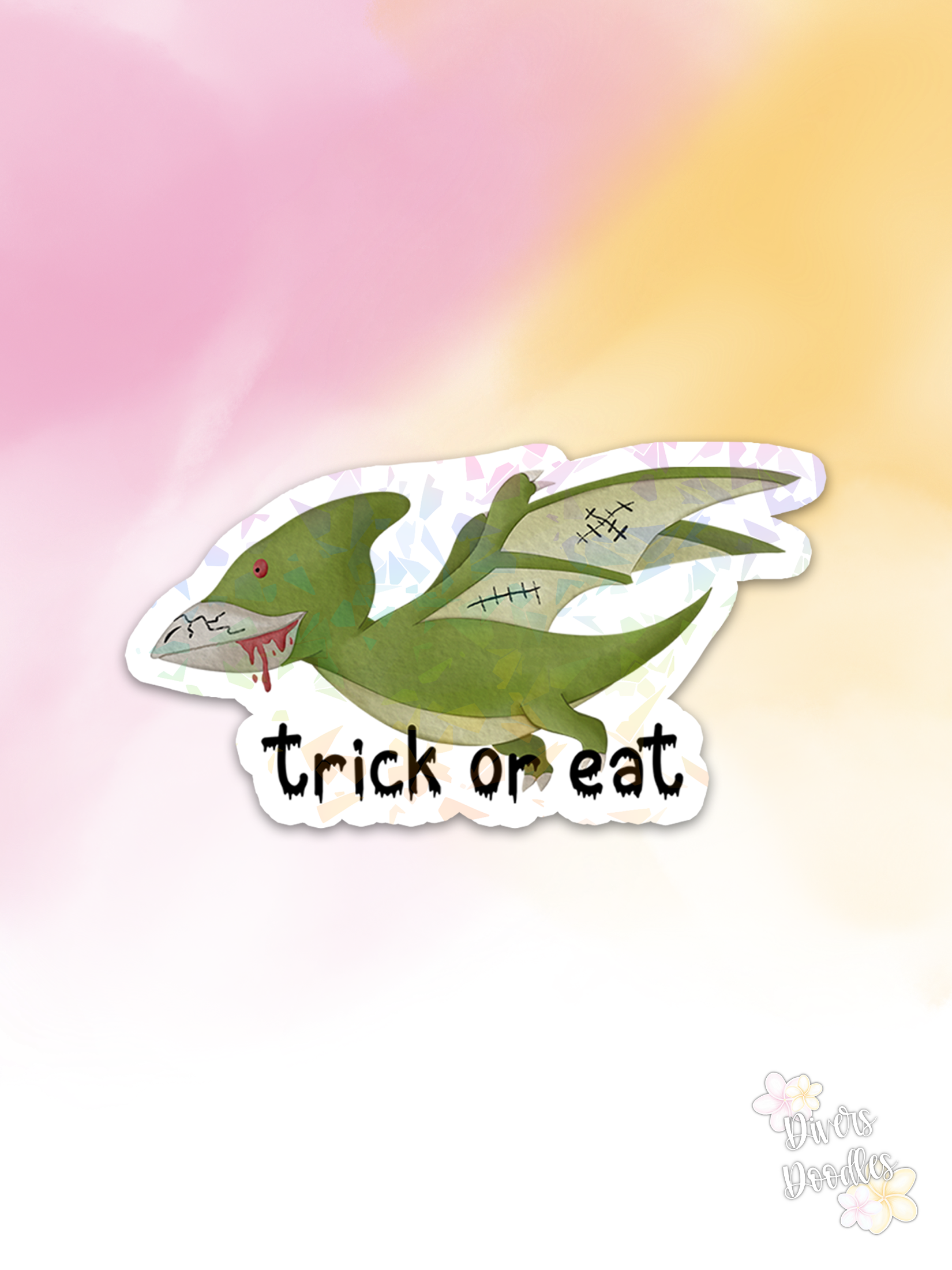 Hand drawn Pterodactyl dinosaur with zombie eyes and the saying "trick or eat". Perfect gifts or party favors for your dinosaur loving adults and kids.